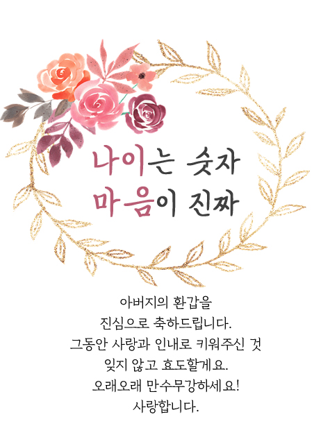꽃다운 아버지의 청춘에 우리라는 꽃을 피워주셔서 감사합니다. 사랑과 정성으로 키워주신 은혜 잊지 않겠습니다. 환갑을 진심으로 축하드립니다.
