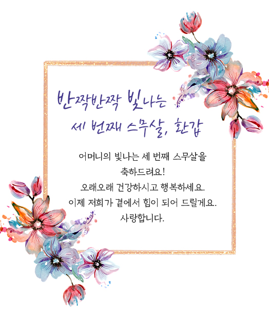 어머니의 빛나는 세 번째 스무살을 축하드려요! 오래오래 건강하시고 행복하세요. 이제 저희가 곁에서 힘이 되어 드릴게요. 사랑합니다.